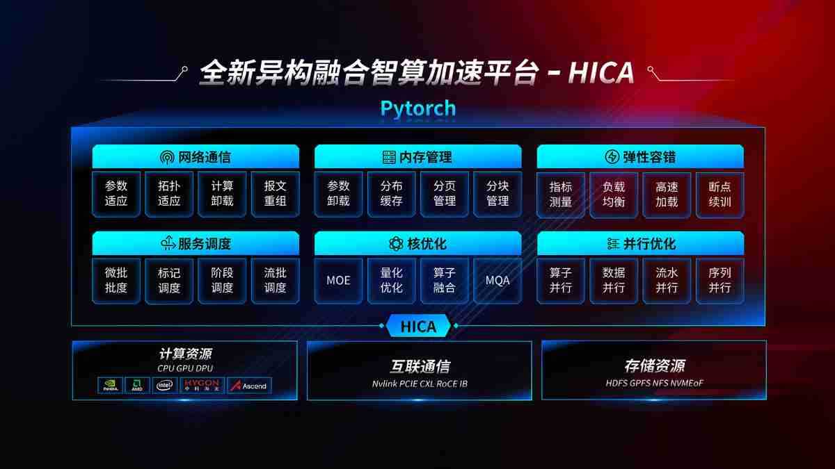 通过自研的服务层、、、中间适配层、、、以及调度编排算法,,,,采用数据并行、、、、模型并行等多种并行方式,,,,把并行计算任务进行有效的分解,,,,使其分别由相应的软件栈和算力资源来承接。。当GPU资源变化,,HICA可以实时动态调度计算子任务并调整模型拓扑和架构,,以充分聚合各种算力资源。。。